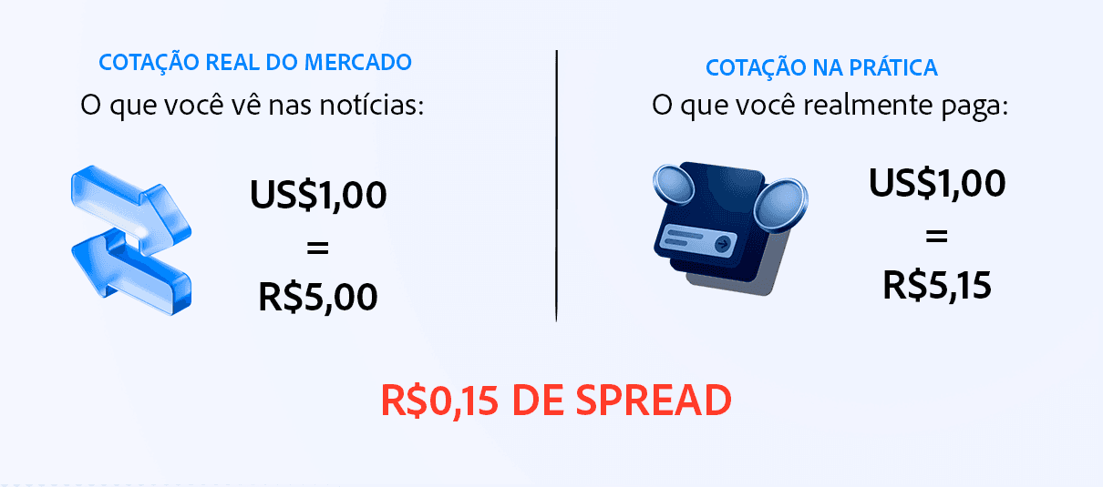 Funciona assim: o dólar está cotado a R$ 5,00. Você vai no banco fazer uma remessa e ele te cobra R$ 5,15 por dólar. Essa diferença de R$ 0,15? Isso é spread.